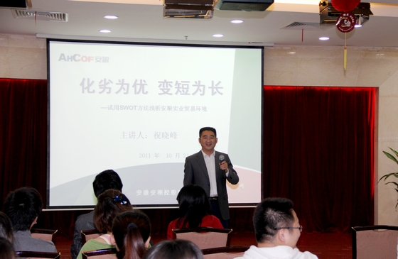 10月21日下午,公司辦公室在五樓多功能廳組織舉辦《化劣為優(yōu),變短為長——試用SWOT方法淺析安糧實業(yè)貿(mào)易環(huán)境》專題講座。本次講座由安糧實業(yè)總經(jīng)理助理祝曉峰(內(nèi)訓(xùn)師)主講。安糧實業(yè)貿(mào)易業(yè)務(wù)部門和公司系統(tǒng)相關(guān)業(yè)務(wù)部門、職能部室共計50多人參加了講座。