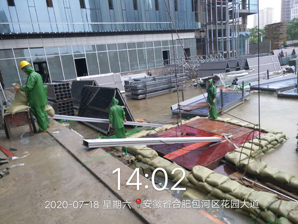 針對入梅以來嚴峻的防汛形勢,已交付及在運營項目積極協(xié)調(diào)物業(yè)公司,共同迎戰(zhàn)強降水天氣。位于合作化路和南二環(huán)交口的安糧國貿(mào)中心是此次防汛形勢較嚴峻的重點項目,特別是降雨量突破合肥市歷史極值的7月18至19日,積水內(nèi)澇直接影響到地下室的安全。險情出現(xiàn)時,一線人員及時匯報,各崗位人員在半個小時內(nèi)到崗參與排險工作。項目部對地庫出入口等易形成倒灌水的危險區(qū)域安排工作人員堆砌沙袋,打開集水井蓋板,保證積水最大流量的排放。同時配合唯品會工作人員啟動區(qū)域排水泵,對易積水難排水區(qū)域進行再清理再疏通,隨著南二環(huán)和合作化路積水水位逐漸下降,安糧國貿(mào)中心順利通過了此次防汛考驗。